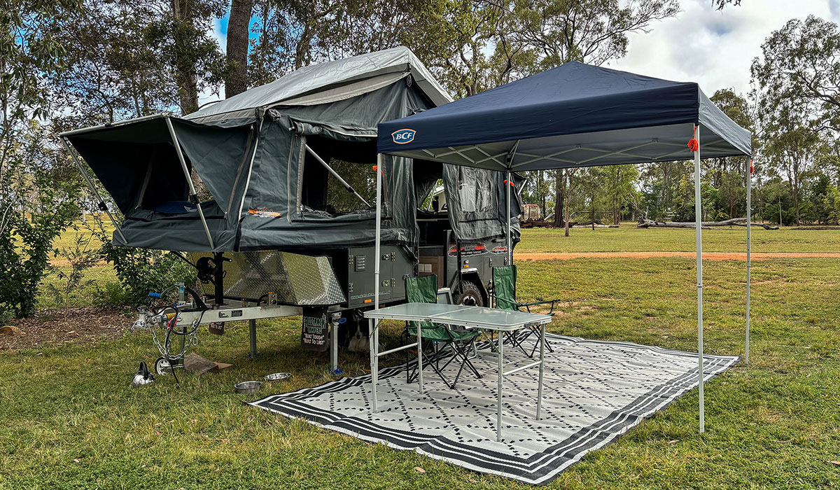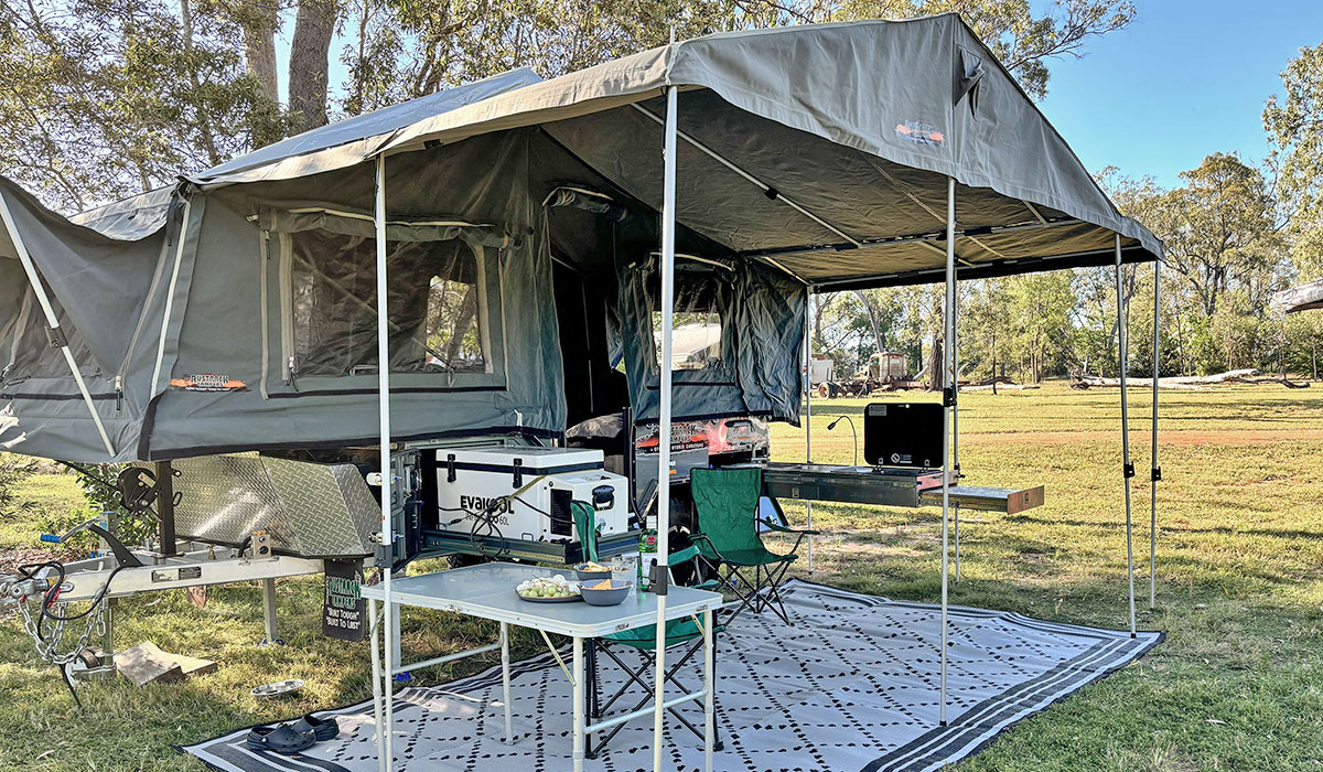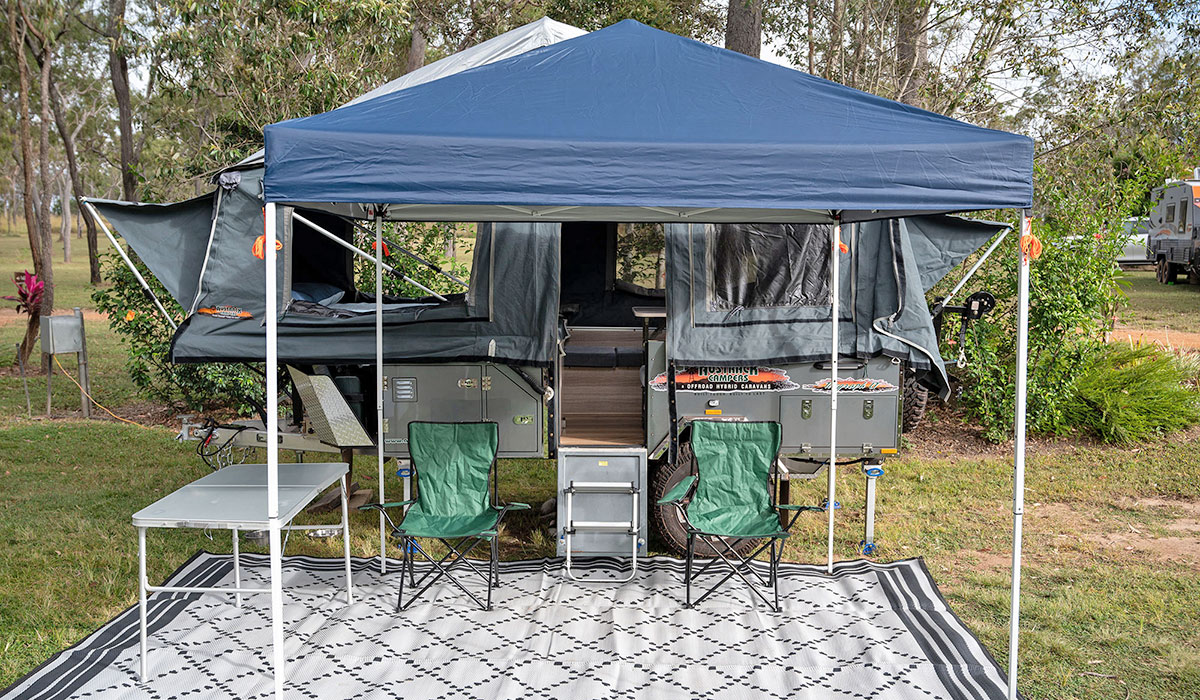 Our Austrack Telegraph Camper Trailer takes camping up a notch and is so much more comfortable than sleeping in a swag or tent. Not that there is anything wrong with that, but there’s something to be said for elevation and dual density foam mattresses, slide-out kitchens and fridge/freezers. It’s nice and compact, utilizing every inch of interior space to provide comfortable sleeping and relaxing. Set-up is easy and takes around 20 minutes, from parking to having the camper trailer ready for use. Please note for outdoor shade, there are two options for you to choose from. We have a canvas annex roof which zips on to the camper trailer, there is a little bit of time involved in setting this up properly, so you should allow an additional 40 minutes for this. If you want quick and easy, then we have a portable marquee which you can position outside the camper trailer. This takes about 10 minutes to set up. We have included photos of both options, so you can see what we’re talking about.