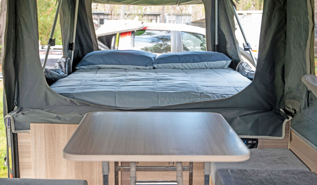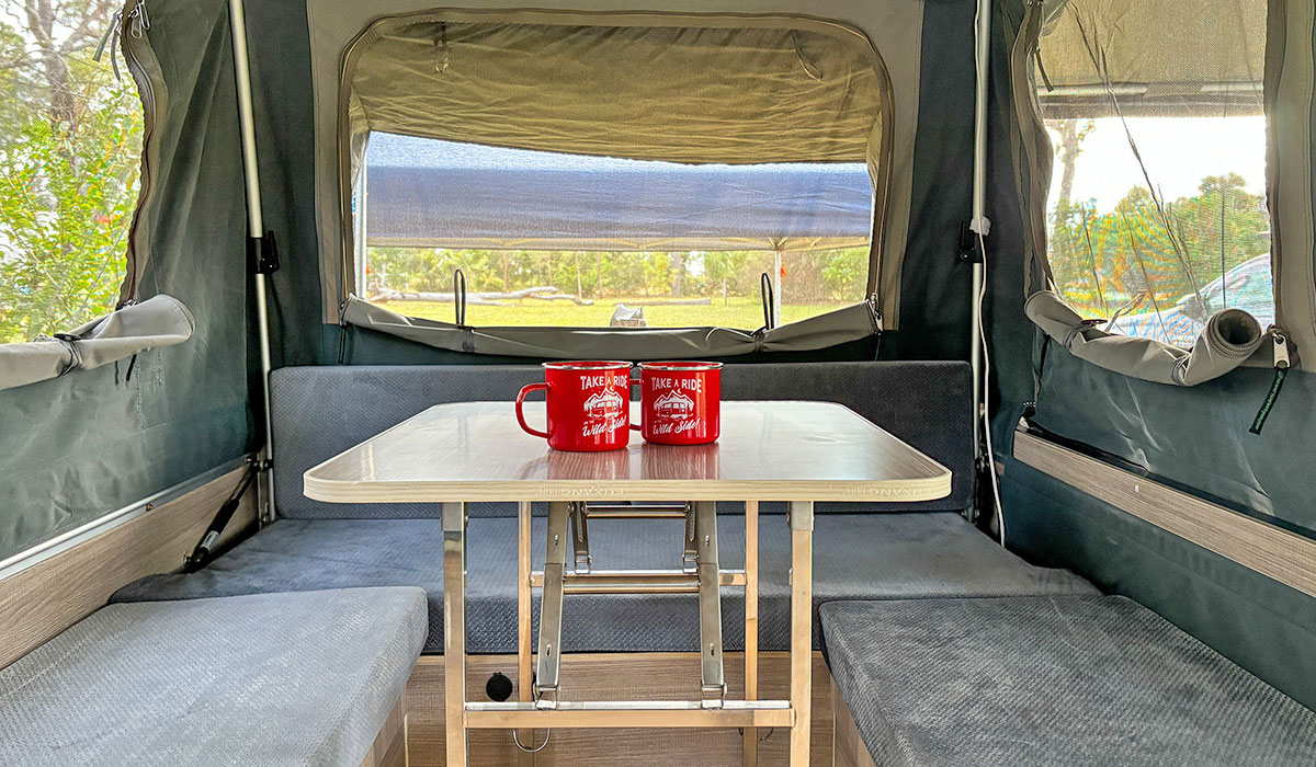 Our Cairns camper trailer is suitable for solo adventurers, couples, and families with young/er children. The main bed is Queen sized and has a dual density foam mattress, which is so comfortable (and so much better than a tent). The internal lounge has a folding table and bench-style seating, but it can be converted to another sleeping area, with a double foam mattress. Please note: Setting up the camper trailer is not physically demanding, but you will need a certain degree of fitness and flexibility to extend the interior poles. Access to the camper trailer is via a short set of stairs, so you will need mobility.