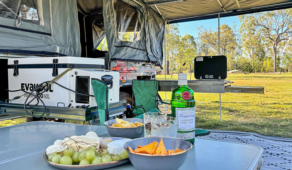 Our Cairns camper trailer hire is ready to go. As well as being lightweight to tow, our Telegraph camper trailer is pretty ‘short’ when set-up (measuring around 4m in length) which means you can easily access all sites, with comfort and space. It came as standard with a lithium battery and solar panel, but we upped the ante by installing a 240 volt input and 30 amp battery charger, which means you can plug it in and keep your drinks frosty at powered sites. But if you are headed off-grid, the bases are still covered for cool drinks as the solar panel will charge the battery during the day, and if you are conservative with your energy consumption, you will be power independent. It’s quick to set up too, taking just 20 minutes without the annex.