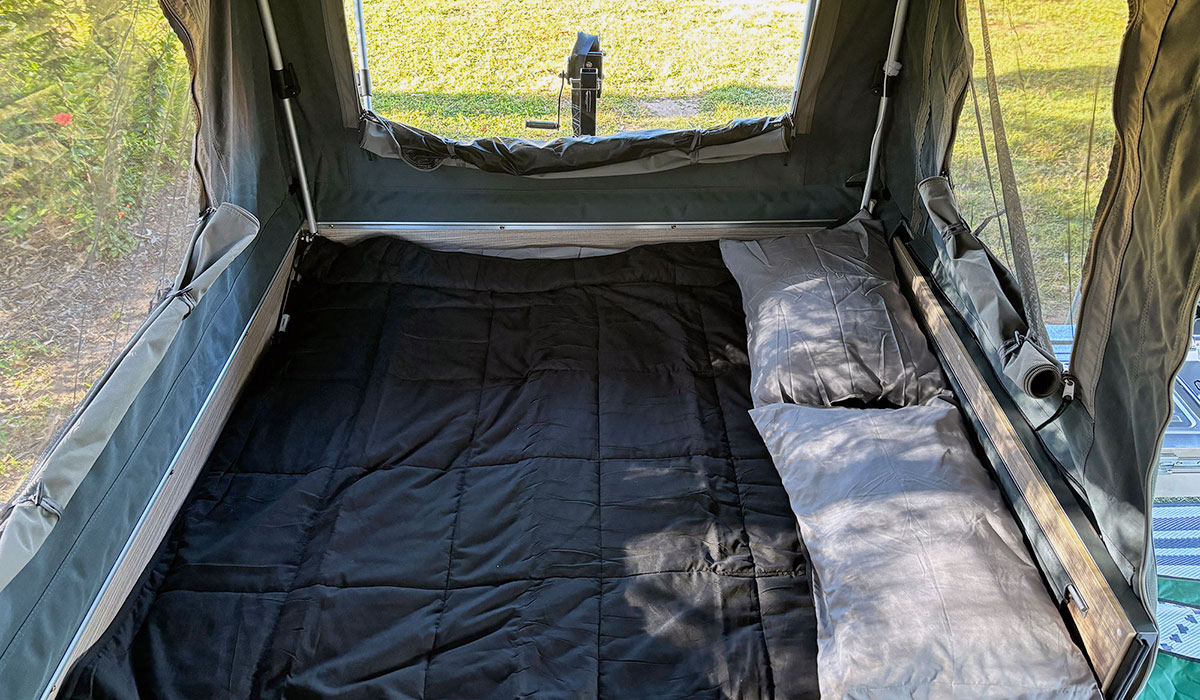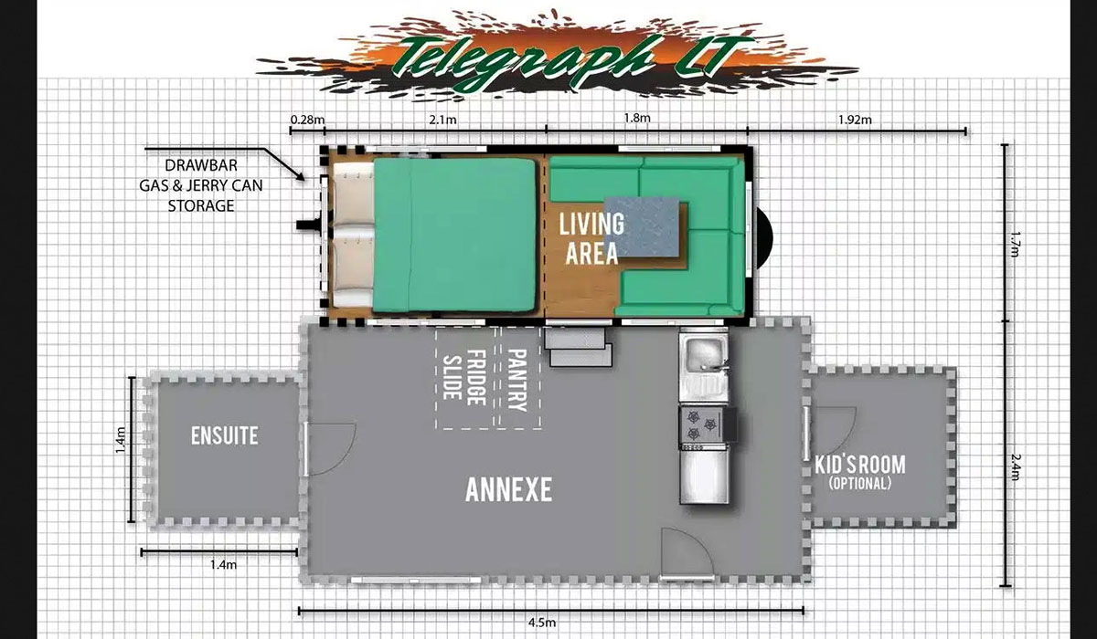 The tare weight is 1,020kg and gross trailer mass is 1,500kg. It’s 4.5m long when open.