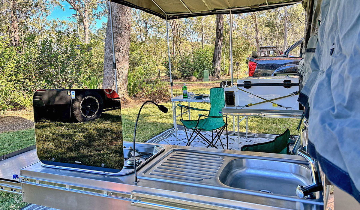 What sort of vehicle can tow our Cairns camper trailer hire? Everything from a Commodore to a Subaru Outback, Toyota Camry and Rav 4, Nissan XTrail and any 4×4. This lean machine comes with everything needed for comfortable camping, including linen and pillows. The 60L fridge / freezer, slide out stainless steel kitchen with cutlery and basic utensils, including tongs, frying pan, camp kettle and pots. There’s a cutting board, plates, bowls and enamel mugs, plastic cups and all the essentials, instant coffee, oil, salt and pepper, paper towels and more. To maximise your outdoor living as Tropical Trailblazers, we’ve also got an outdoor camping mat, camping chairs and table.