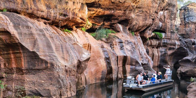 The journey starts with an air conditioned coach ride to the Gorge, during which you’re given a fascinating overview of the Gorge’s European history, past owners and bush tucker. Then it’s into the Gorge for the guided tour, which either starts or ends with the boat ride. This tour requires reasonable fitness and mobility, walking on paths, staircases and elevated boardwalks, to access and cross the escarpment. The Glass Bridge is a highlight, providing views straight down to the water below and up and down the gorge itself. The boat ride puts you up close to the walls, where you can admire the changing colours and patterns. Keep an eye out for crocodiles and fish, with St Andrew’s Cross spiders on the walls. These tours include return transfers from Cobbold Village and must be booked in advance to avoid disappointment (they do book out during peak season, in the middle of the year).