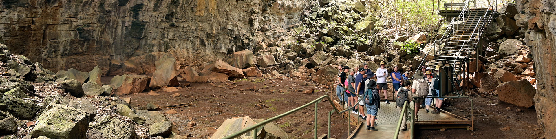 You can only access the lava tubes and caves in the Undara Volcanic National Park on guided tour. When you are staying at Discovery Resorts – Undara, the tour departure point is clearly sign-posted and is adjacent to Fettler’s Iron Pot Bistro. Here you are met by a guide who drives you to the tubes and caves. An informative commentary is provided throughout the tour. On our 2023 visit to Undara, we did the 2 hour Archway Explorer Tour, which included a few tubes. The Arch and Ewamian Tubes, which are wreathed in lush, vine-thicket rainforest, and the Road Tube. Access to all tubes was on comfortable timber walkways. At the last tube we walked a little way into the system, leaving the daylight behind and relying on our guide’s torchlight. All of the ones we visited were impressive. There is also a 2 hour Wind Tunnel Explorer Tour, which involves climbing over rocks and uneven surfaces. We have not done this tour.