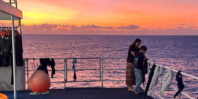 Dessert was served at 8pm and then we all settled in for the night. As a family of 3, we were in different cabins (as all cabins other than the 1 x quad share room, only accommodate a maximum of 2 people); Julie and Ethan shared a twin cabin, while Richard was in a separate twin cabin, with another guest on the boat. All the cabins are air conditioned and have ensuite facilities, and there’s nothing better than a hot shower at the end of a big day in the sea. It was a relatively early night. Richard woke early for the sunrise, but Julie and Ethan slept in until 7am – with breakfast served at 7.30am. Breakfast included fresh fruits, toast, cereals and cooked options. While we ate, OceanQuest moved to a new reef site.