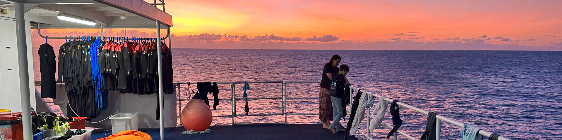 Once we were aboard OceanQuest, we were greeted by the crew who provided an overview of the boat and the daily itinerary. We were also allocated our rooms, with time to move our bags before we were straight into the diving / snorkelling again, with a site briefing at 3.15pm. Our son’s ears had ‘fixed’ themselves (thankfully) so it was dive time on a site called Coral Gardens at Saxon Reef. We splashed down at 3.58pm and spent the next 50 minutes exploring the coral walls and bommies. There was an abundance of Great Barrier Reef fish, including pink anemonefish, slate sweetlips, schools of striped fusiliers streaming around the reef, colourful giant clams, sea squirts, a lionfish, barramundi cod, coral trout and large beds of staghorn corals. We had an hour to refresh and relax before dinner, so we headed to the sundeck to watch the sunset and it was spectacular! After dinner, there’s the option for a night dive (we didn’t take it) and the free Sharks in the Dark experience. For divers, you see the sharks in the water, while snorkelers can lay down on the lowered platform for a front row seat to the hunting action – we did it and saw lots of giant trevally.