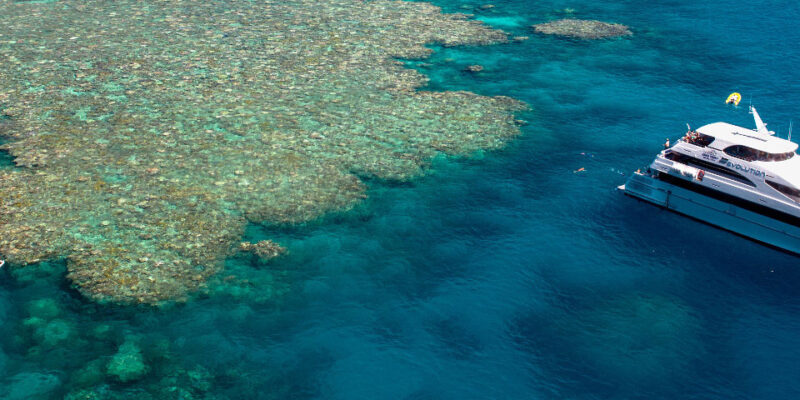 Down Under Cruise and Dive have one of the latest dive and snorkel boats in the Cairns reef tours fleet. Evolution was custom designed and built to provide first class passenger comfort. It has 3 decks, which are a combination of air conditioned interiors and exterior sun decks. On their Cairns reef day tours, they visit 2 different sites and provide up to 5 hours at the reef. There’s unlimited snorkeling and a range of optional extras, including snorkeling tour with a Marine Biologist, a semi submersible tour, scenic heli flight over the reef and certified and introductory scuba diving. Morning and afternoon tea and a hot and cold buffet lunch are included, as is a glass of wine on the way home.